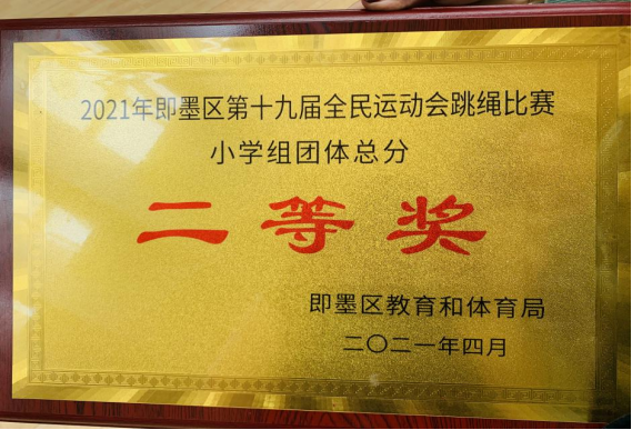 天朗气清,惠风习习,青岛市即墨区第十九届全民运动会跳绳于2021年4月27日如期举行。我校花样跳绳队首次出征参赛,队员有李哲宇,昌伊蕊,贾成军,王齐尧,陈涵宇,郝俊萌,邱钰航,唐硕,李泽祯,陈然,赵王乾元。在比赛中我校代表队表现突出,荣获即墨区第十九届全民运动会跳绳比赛第四名,团体二等奖。